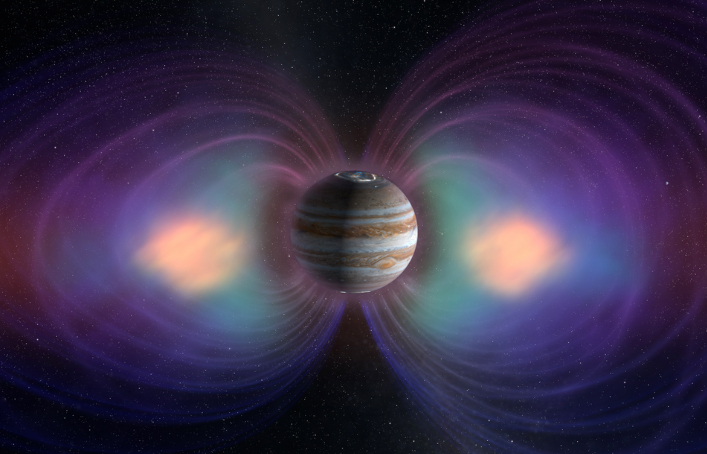 Юпитер обладает самым сильным магнитным полем среди всех планет. Оно в десятки тысяч раз мощнее земного. Поле создается в слое металлического водорода под высоким давлением. На магнитное поле Юпитера влияет спутник Ио. Он активно извергает вещества, которые формируют кольцо плазмы. Оно вращается вместе с планетой и подпитывает радиационные пояса, создавая опасную для техники зону вокруг Юпитера.